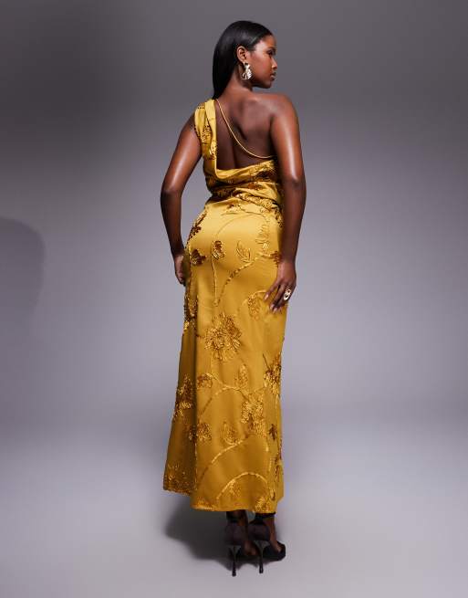 ASOS DESIGN – Drapowana sukienka midaxi na jedno ramię z haftowanym wzorem w kolorze ochry