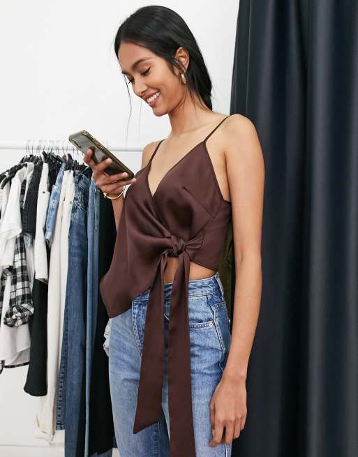 ASOS DESIGN – Drapowany asymetryczny top w kolorze czekoladowym na ramiączkach ze spiczastym dołem