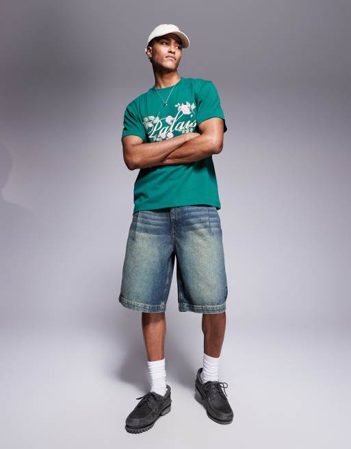 ASOS DESIGN – Długie szerokie szorty jeansowe z zakładkami i zielonym cieniowaniem