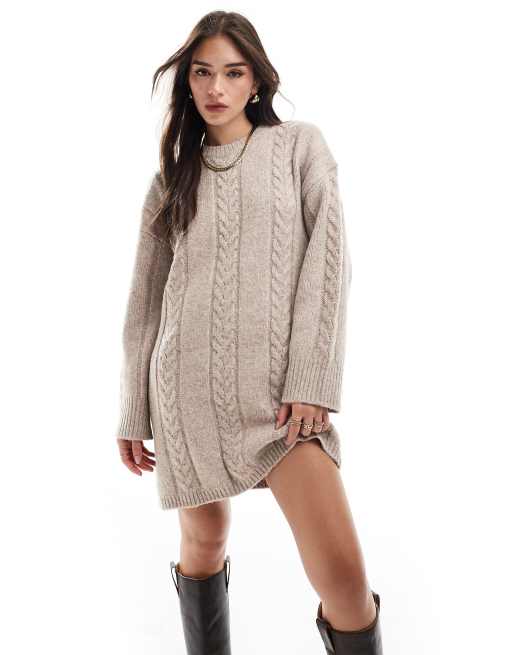 ASOS DESIGN – Dzianinowa sukienka mini w kolorze taupe z okrągłym dekoltem i warkoczowym splotem