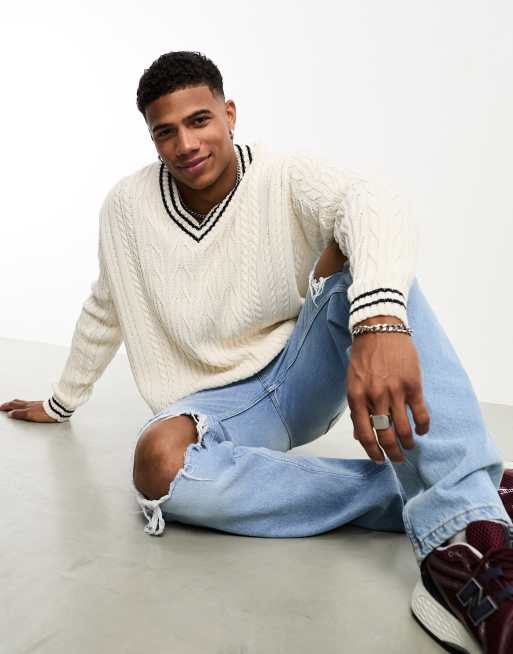 ASOS DESIGN – Dzianinowy sweter oversize o warkoczowym splocie i krykietowym stylu w kremowym kolorze z granatowymi lamówkami