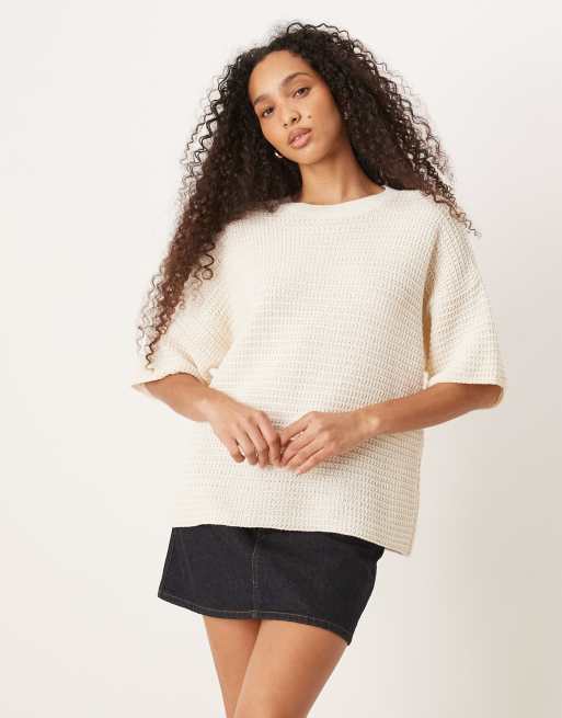ASOS DESIGN – Dzianinowy T-shirt w kolorze ecru o luźnym kroju z ozdobnym ściegiem