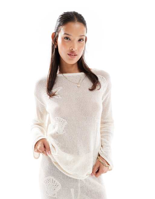 ASOS DESIGN – Dzianinowy top w kolorze ecru z dekoltem w łódkę i motywem muszli