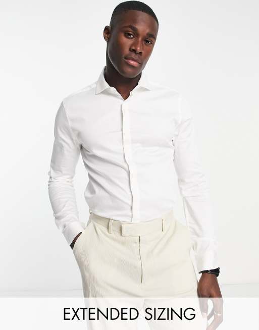 ASOS DESIGN – Elegancka dopasowana satynowa koszula z kołnierzykiem włoskim w białym kolorze