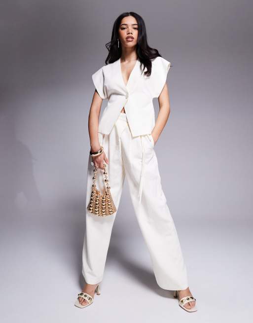 ASOS DESIGN – Elegancki zestaw lniany w kolorze kości słoniowej: wiązany top i spodnie