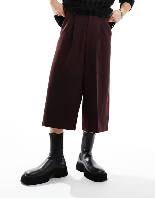 ASOS DESIGN – Eleganckie bordowe spodnie z krótszymi nogawkami z mieszanki wełny