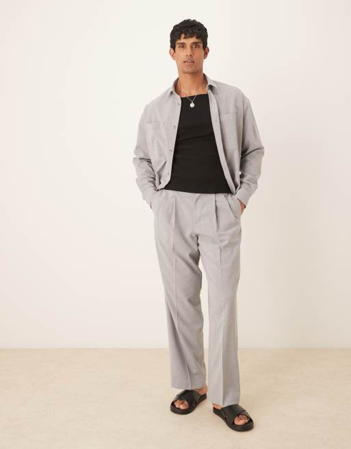 ASOS DESIGN – Eleganckie szare spodnie z materiału o wyglądzie lnu z szerokimi nogawkami i podwójnymi zakładkami, część zestawu