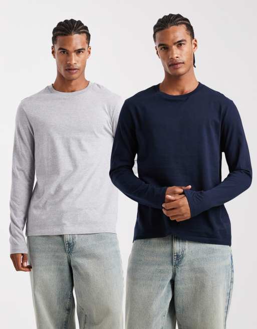 ASOS DESIGN – Essentials – Zestaw 2 T-shirtów z długimi rękawami w kolorach granatowym i szarym melanżowym