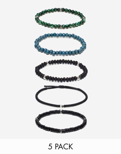 ASOS DESIGN – Festival – Zestaw 5 czarnych i zielonych bransoletek ze sznurka i koralików