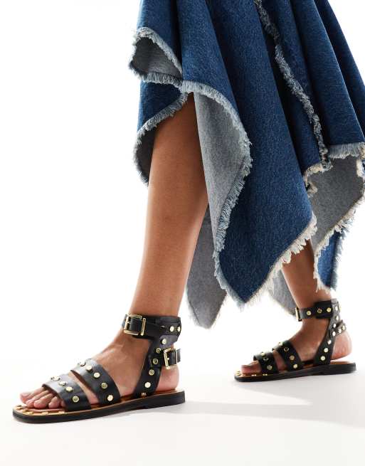 ASOS DESIGN – Fiji – Czarne płaskie sandały ze skóry z ćwiekami