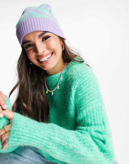 ASOS DESIGN – Fioletowo-zielona czapka beanie z żakardowej dzianiny w paski zebry