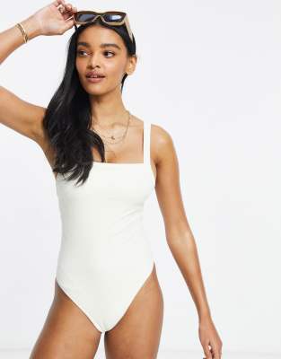 ASOS DESIGN – Fuller Bust – Aksamitny, prążkowany strój kąpielowy z kwadratowym dekoltem w kolorze kości słoniowej