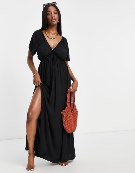 ASOS DESIGN Fuller Bust – Czarna sukienka plażowa maxi ze zwiewnymi rękawami
