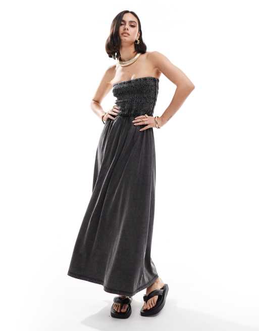 ASOS DESIGN – Grafitowa sprana sukienka maxi z dekoltem bandeau, pełną spódnicą i marszczoną górą