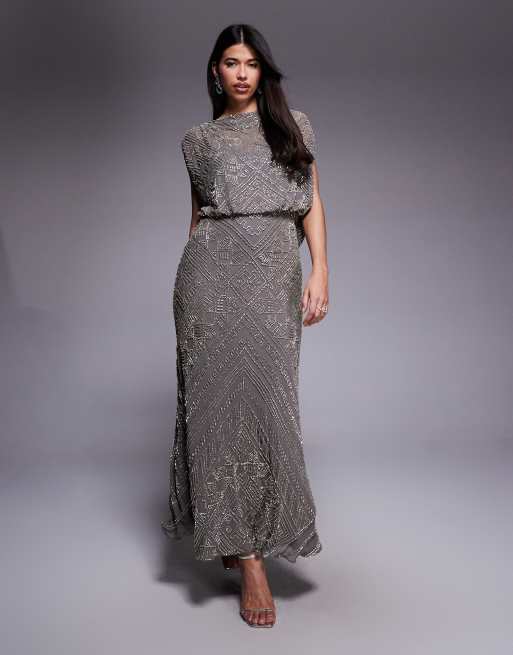 ASOS DESIGN – Grafitowa zdobiona na całej powierzchni sukienka maxi z drapowanym dekoltem