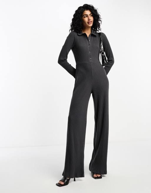 ASOS DESIGN – Grafitowy bardzo miękki kombinezon prążkowany zapinany na guziki