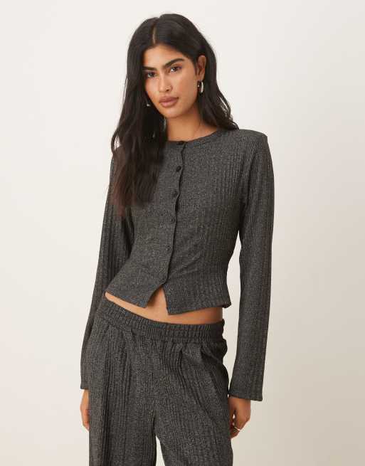 ASOS DESIGN – Grafitowy melanżowy prążkowany top zapinany na guziki z długimi rękawami