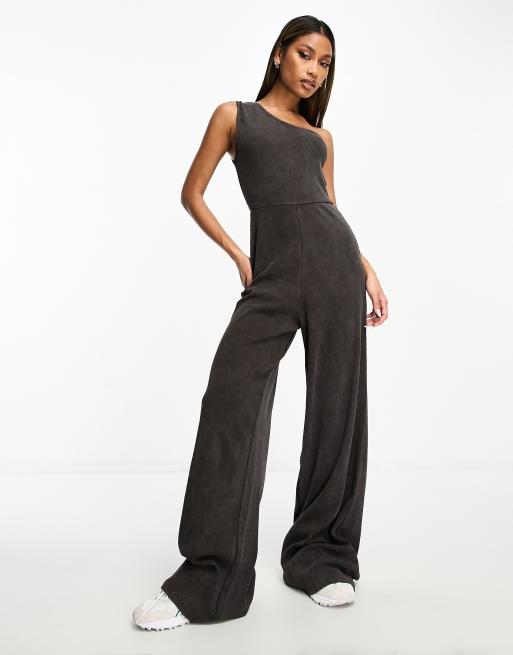 ASOS DESIGN – Grafitowy prążkowany kombinezon na jedno ramię z efektem sprania
