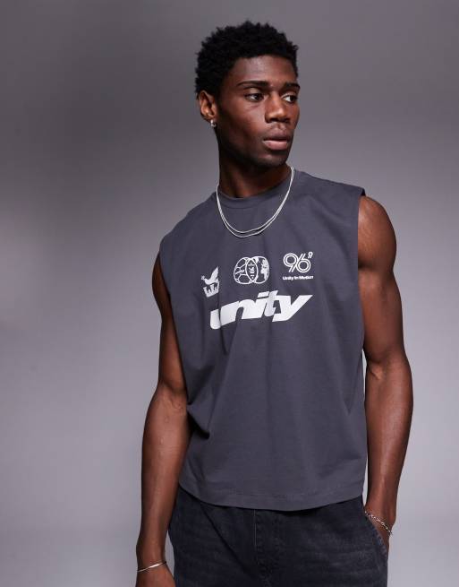 ASOS DESIGN – Grafitowy top bez rękawów o pudełkowym kroju oversize z grafiką tekstową
