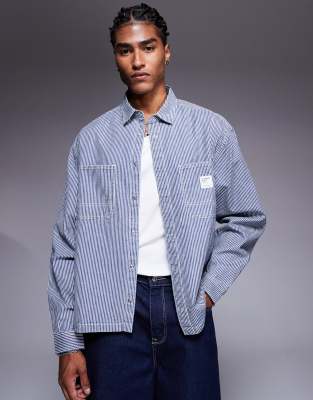 ASOS DESIGN – Granatowa koszula jeansowa o pudełkowym kroju oversize w paski z naszywką