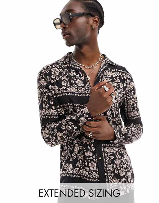 ASOS DESIGN – Granatowa koszula z kołnierzykiem kubańskim i wzorem w liście