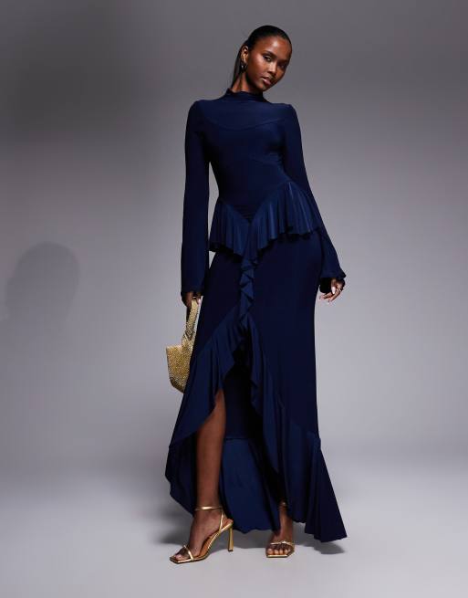 ASOS DESIGN – Granatowa miękka sukienka maxi z długimi rękawami i baskinką