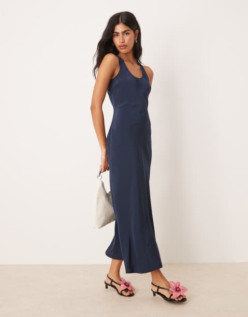 ASOS DESIGN – Granatowa satynowa sukienka maxi na ramiączkach z dekoltem w kształcie litery U