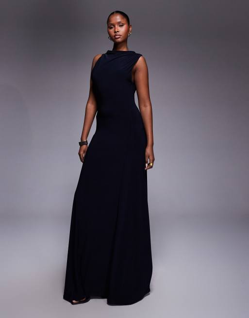 ASOS DESIGN – Granatowa sukienka maxi z zabudowanym dekoltem i marszczonym tyłem z tunelami
