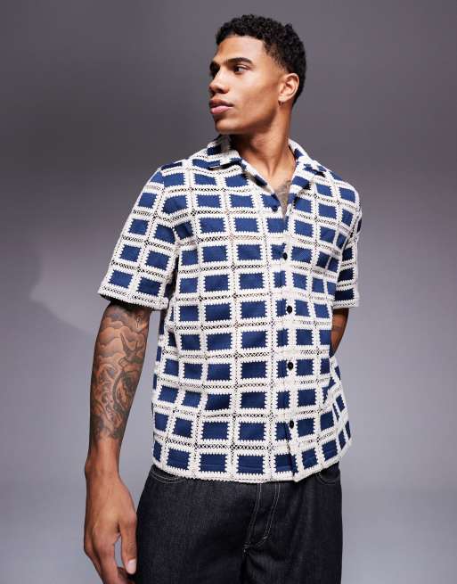 ASOS DESIGN – Granatowa szydełkowana koszula o pudełkowym kroju z kołnierzykiem kubańskim