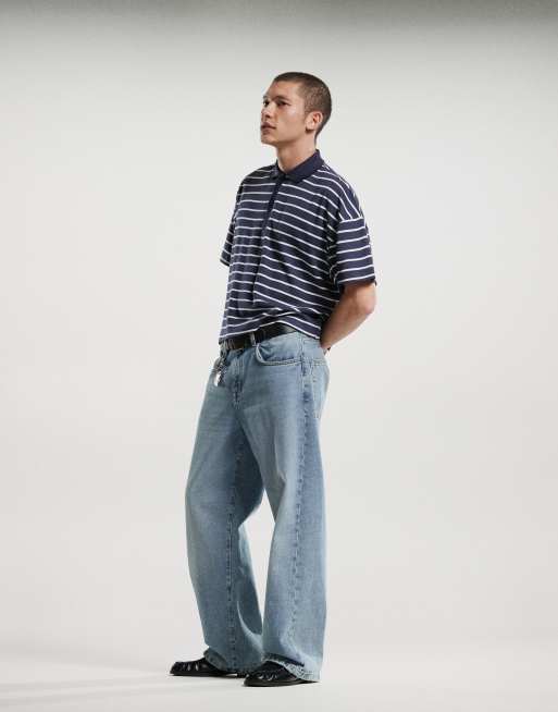 ASOS DESIGN – Granatowo-biała krótka koszulka polo oversize z obniżoną linią ramion w paski
