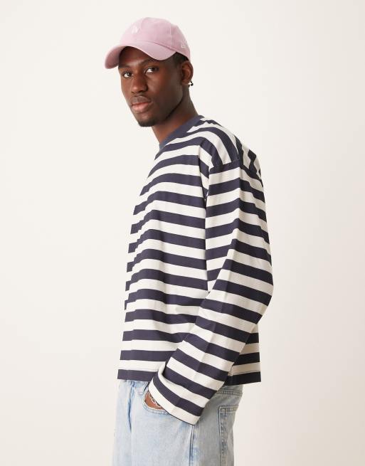 ASOS DESIGN – Granatowo-biały pudełkowy T-shirt oversize z długimi rękawami w paski