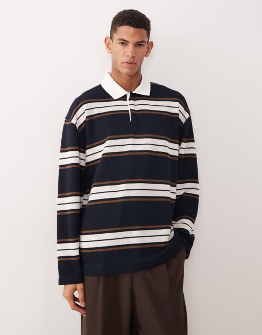 ASOS DESIGN – Granatowo-brązowa gruba koszulka polo oversize w paski z długimi rękawami w stylu rugby