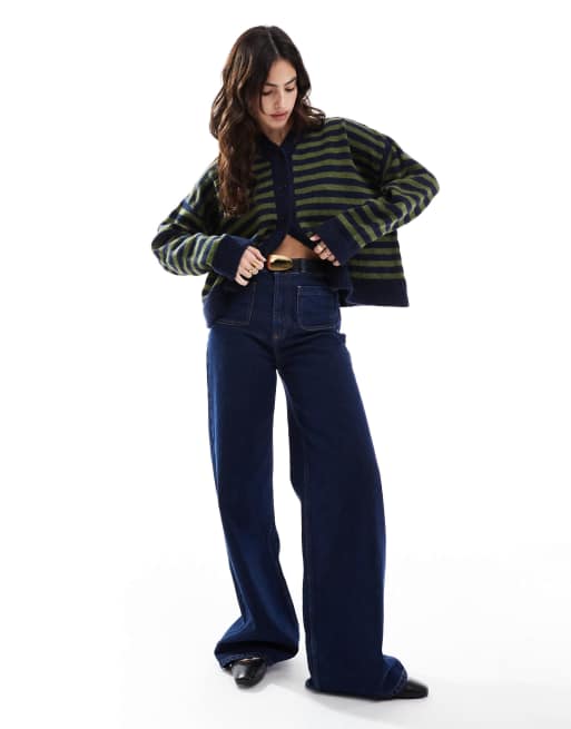ASOS DESIGN – Granatowo-zielony dzianinowy kardigan z dekoltem w szpic w paski