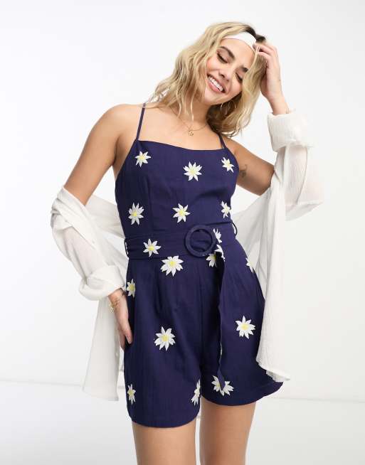 ASOS DESIGN – Granatowy krótki kombinezon z kwadratowym dekoltem i paskiem w haftowany wzór w stokrotki