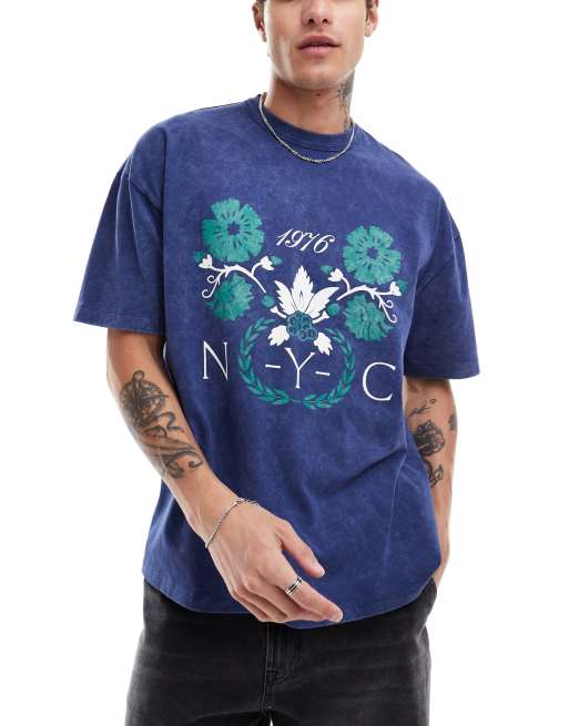 ASOS DESIGN – Granatowy T-shirt oversize o gramaturze 220g/m² z uczelnianym nadrukiem z przodu i efektem sprania