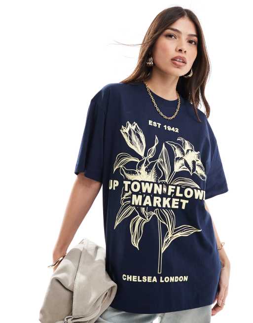 ASOS DESIGN – Granatowy T-shirt oversize z grafiką z napisem „Flower Market”