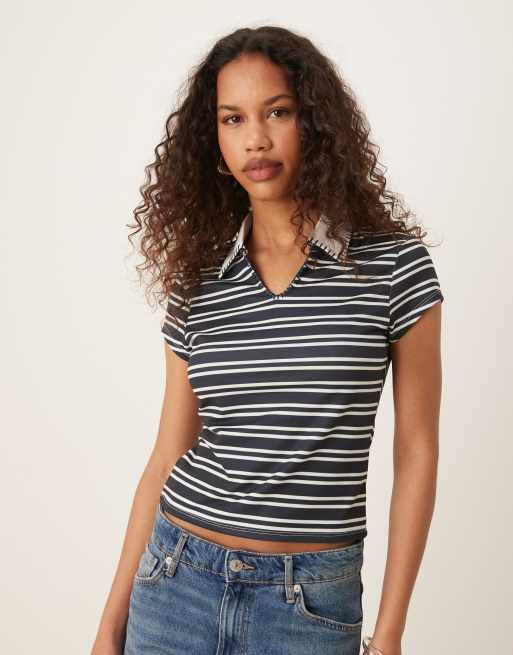 ASOS DESIGN – Granatowy T-shirt z w paski z kołnierzykiem polo z ozdobnym szwem