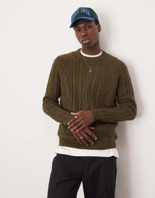 ASOS DESIGN – Gruby sweter z okrągłym dekoltem z dzianiny o warkoczowym splocie w kolorze khaki