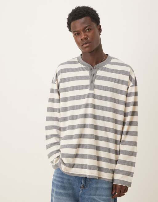 ASOS DESIGN – Gruby T-shirt oversize z długimi rękawami i kołnierzykiem typu henley w szare paski