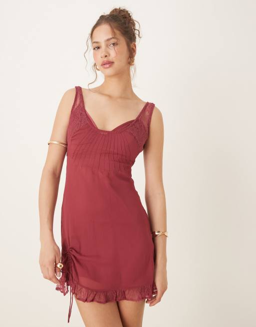 ASOS DESIGN – Jagodowa szyfonowa sukienka mini z koronką z marszczonym dołem