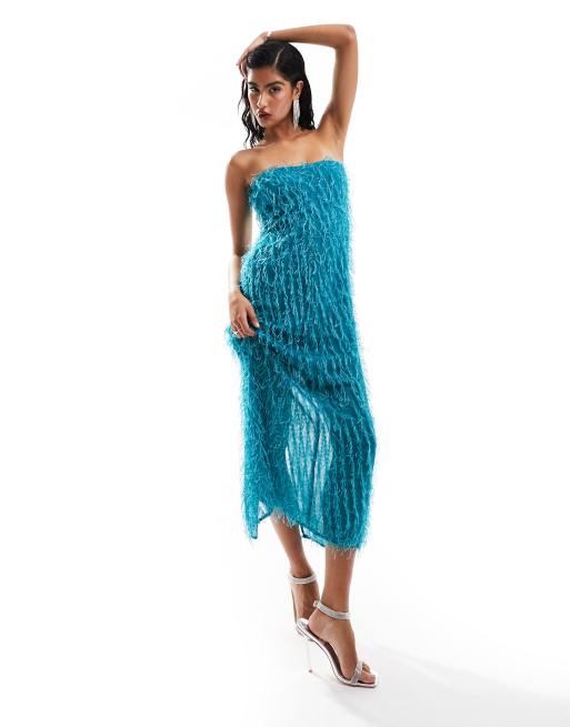 ASOS DESIGN – Jaskrawoturkusowa puszysta sukienka midi z dekoltem bandeau