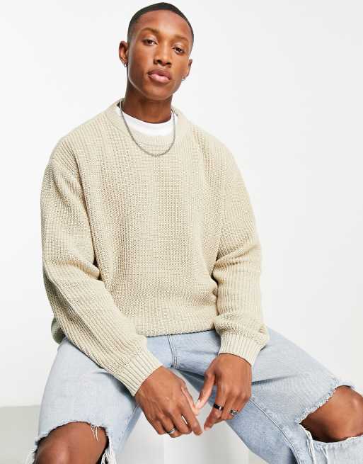 ASOS DESIGN – Jasnobeżowy dzianinowy prążkowany sweter oversize typu fisherman