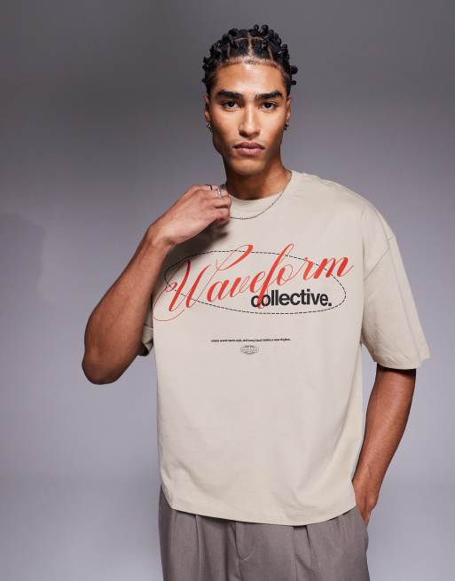 ASOS DESIGN – Jasnobeżowy T-shirt oversize o pudełkowym kroju z nadrukiem z przodu