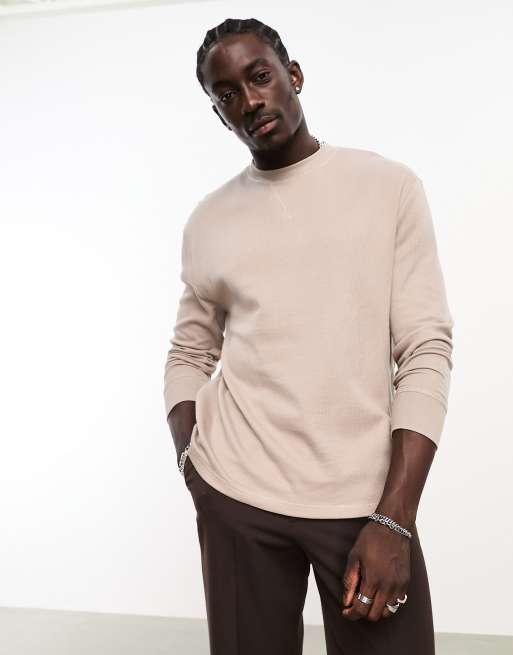ASOS DESIGN – Jasnobrązowy luźny T-shirt z długimi rękawami o waflowej strukturze