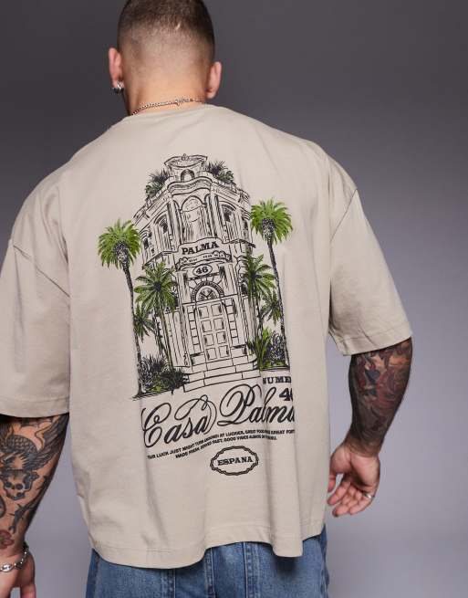 ASOS DESIGN – Jasnobrązowy pudełkowy T-shirt oversize z nadrukiem z przodu i na plecach