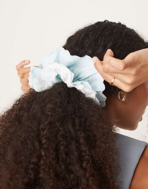 ASOS DESIGN – Jasnoniebieska gumka do włosów w kratkę vichy z falbanką z haftem angielskim