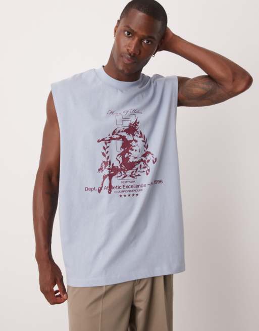 ASOS DESIGN – Jasnoniebieski top bez rękawów oversize z obniżonymi dołami pachowymi i grafiką