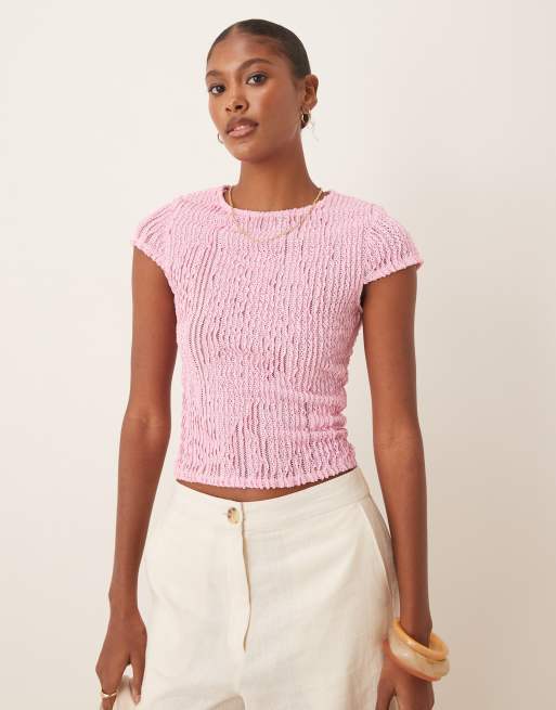 ASOS DESIGN – Jasnoróżowa fakturowana krótka koszulka z falbankami