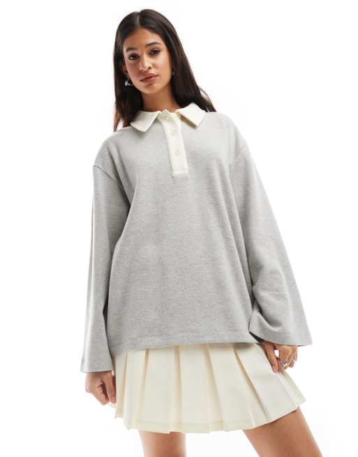ASOS DESIGN – Jasnoszara bardzo miękka koszulka polo oversize z długimi rękawami