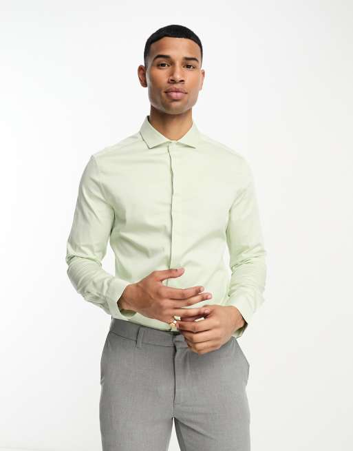 ASOS DESIGN – Jasnozielona satynowa koszula o obcisłym kroju z krótkim kołnierzem